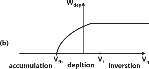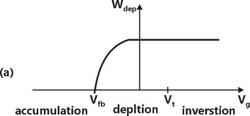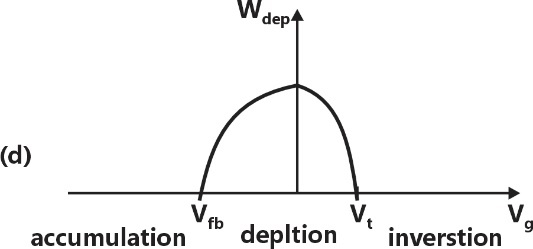 For a MOS capacitor, and are the flat-band voltage and the threshold voltage, respectively. The variation of the depletion width for varying gate voltage is best represented by