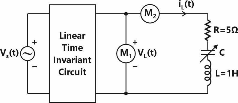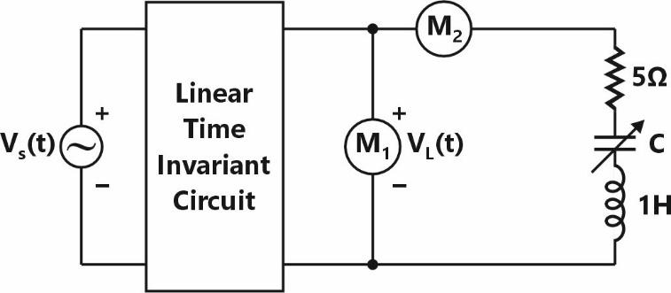 What should be the value of the variable capacitor such that the RMS readings on and are 25 V and 5 A, respectively?