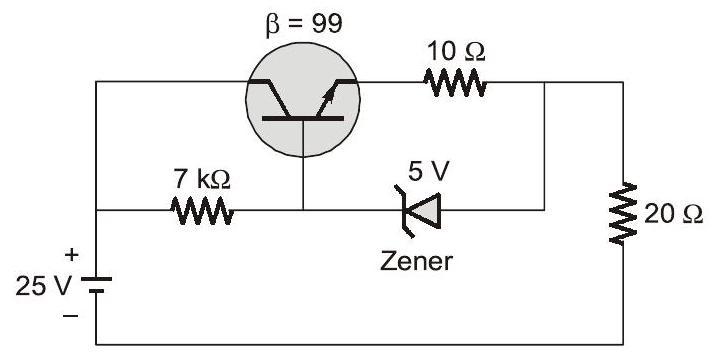 The Zener diode in circuit has a breakdown voltage of . The current gain of the transistor in the active region in 99. Ignore base-emitter voltage drop . The current through the 20Ω resistance in milliamperes is _________ (Round off to 2 decimal places).