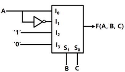 A 4 × 1 MUX is used to implement a 3-input Boolean function as shown in figure. The Boolean function F(A, B, C) implemented is