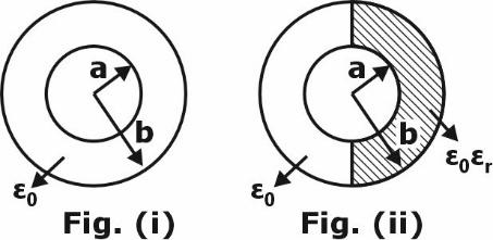IncorrectAn air filled cylindrical capacitor (capacitance ) of length , with and as its inner and outer radii, respectively, consists of two coaxial conducting surfaces. Its cross-sectional view is shown in Fig. (i). In order to increase the capacitance, a dielectric material of relative permittivity is inserted inside of the annular region as shown in Fig. (ii). The value of for which the capacitance of the capacitor in Fig. (ii), becomes is