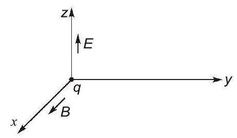 In the figure, the electric field and the magnetic field point to and directions, respectively, and have constant magnitudes. A positive charge ' ' is released from rest at the origin. Which of the following statement(s) is/are true.