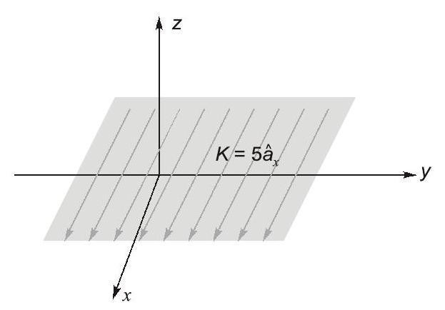 An infinite surface of linear current density exists on the plane, as shown in the figure. The magnitude of the magnetic field intensity at a point due to the surface current in Ampere/meter is __________ (Round off to 2 decimal places).