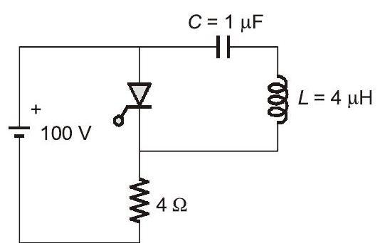 The circuit shown in the figure has reached steady state with thyristor '' in OFF condition. Assume that the latching and holding currents of the thyristor are zero. The thyristor is turned at . The duration in microseconds for which the thyristor would conduct, before it turns off, is ___ (Round off to 2 decimal places).