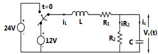 The switch in the following circuit, shown in fig 3, has been connected to the 12 V source for a long time. At t=0, the switch is thrown to 24V. The value of L=2H,
