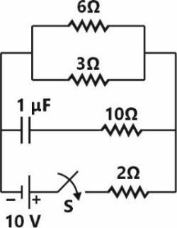 The circuit shown in the figure with the switch S open, is in steady state. After the switch S is closed, the time constant of the circuit in seconds is