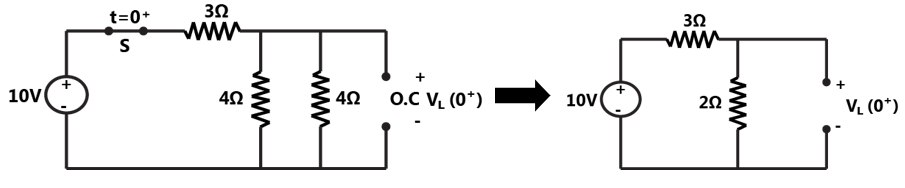 At t = 0+ S is opened & inductor is replaced by a current source & capacitor is replaced by a voltage source.