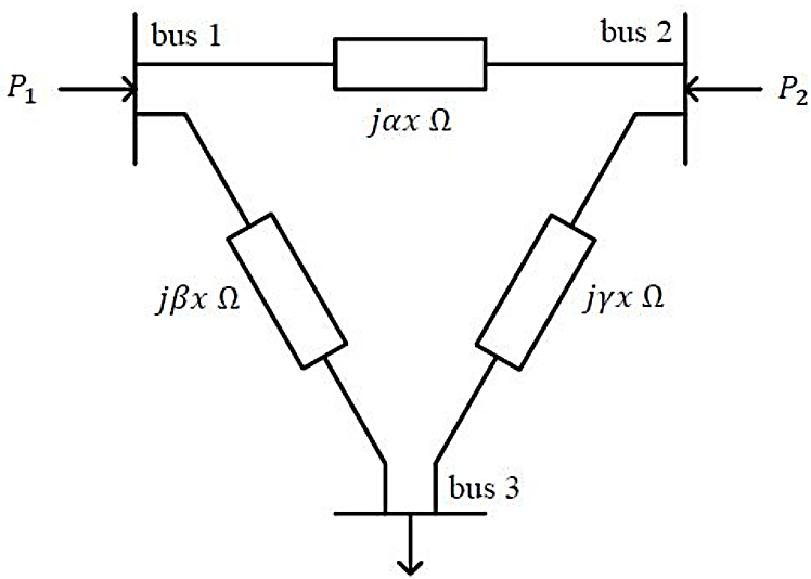 For the three-bus lossless power network shown in the figure, the voltage magnitudes at all the buses are equal to 1 per unit , and the differences of the voltage phase angles are very small. The line reactances are marked in the figure, where , and are strictly positive. The bus injections and are in pu. If , where , and the real power flow from bus 1 to bus 2 is , then which one of the following options is correct?