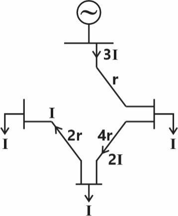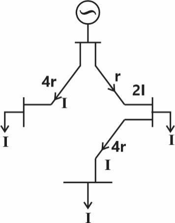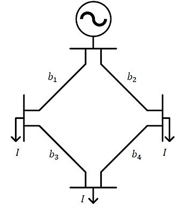 The figure shows the single line diagram of a 4-bus power network. Branches , , and have impedances , and per-unit (pu), respectively, where , with and . The current drawn from each load bus (marked as arrows) is equal to pu, where . If the network is to operate with minimum loss, the branch that should be opened is